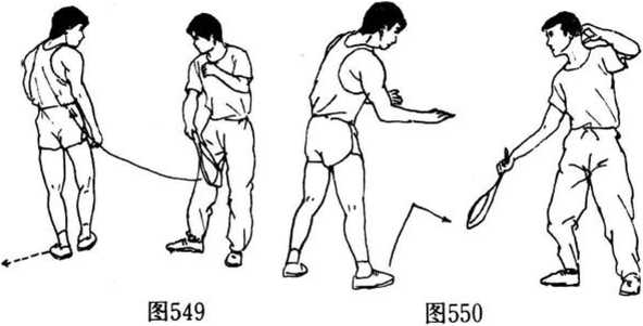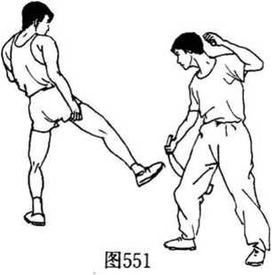 助手手持革带向拳手拦腰横扫(或由上向下竖抽拳手头 面部),拳手后退闪让,随即回身踹击助手由后下方向前上方撩出的革带,高约与膝 头相平(图549、550、 551).要领:这组动徉主 要练习拳手后退之中突 然反击对手的能力,双 方动作一定要连贯迅 速,不可脱节,否则难 以收到良好效果,反而 容易养成迟钝的不良习 惯。
