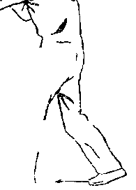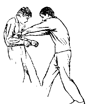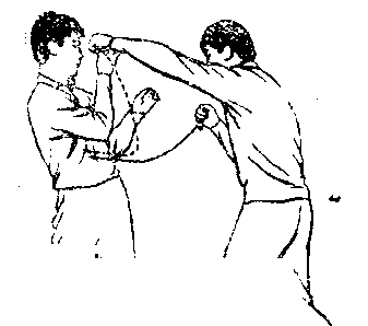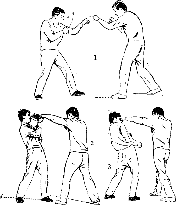 双人格斗式(图197—1)前进步以左直拳攻击对方面部对方如以右手拨防并后垫步时即上右步以双直拳攻击对方中盘(图197—2、3)