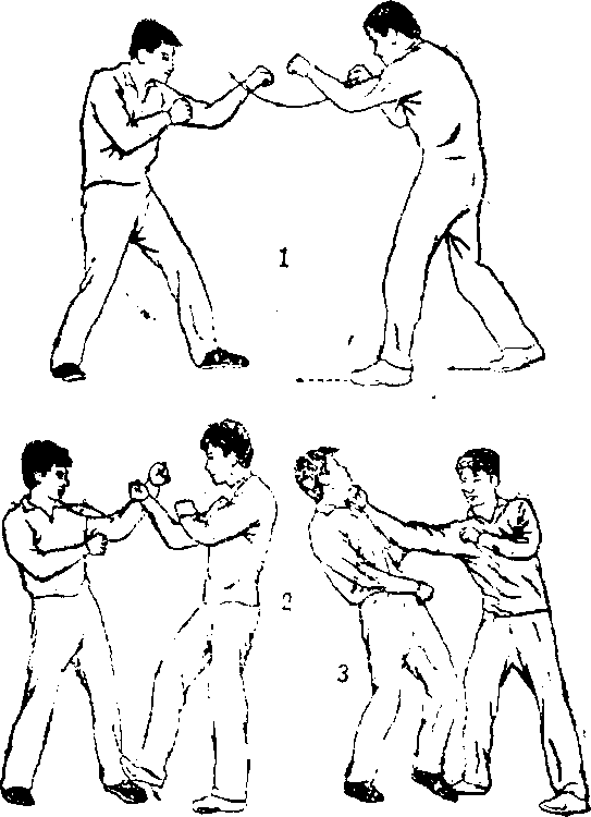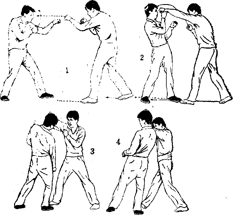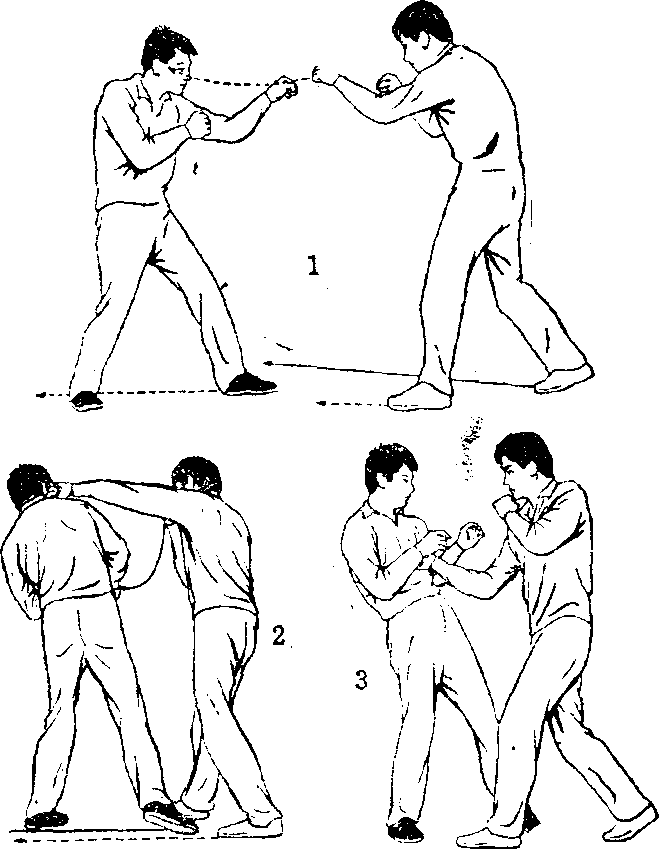 双人格斗式(图201—1)前进步、右上步同时以左拳摆击对方右侧太阳穴(图201—2),对方如向后朝步防即上左步以右拳勾击对方中盘(图201—3)。