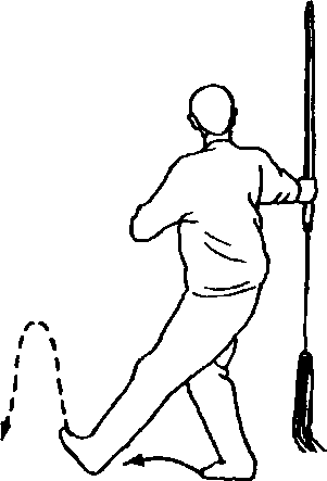 要点:此势由东转到西(180。),其过程是由右脚后撤半 步,左脚尖里扣,右脚尖外撇的一系列步法、身法、剑法协调配 合完成的。