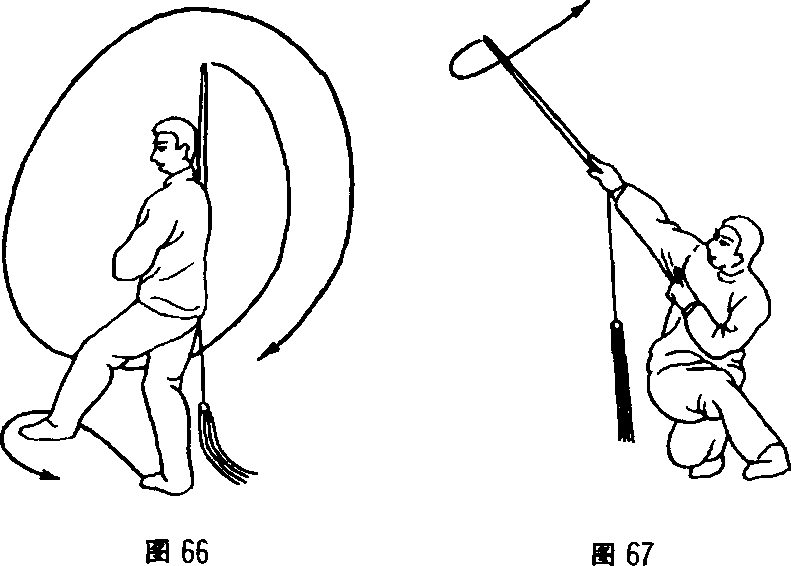 方(图66)。接着左脚向前落地,右脚向前上步,脚尖里扣,左 脚插向右脚后,两腿屈蹲成歇步。同时右手持剑向右上反撩 剑,力在剑刃前端,左剑指置于右肩前,手心向右。(图67)