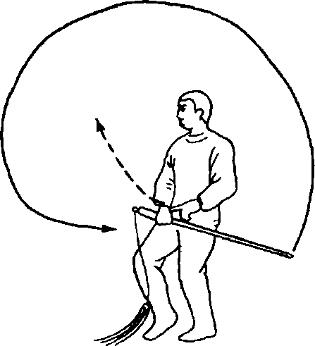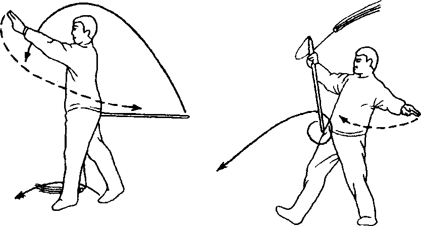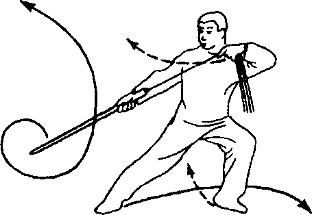 2.向左转腰以剑柄带穗按顺时针方向绕立圆,随即右转 腰向前下劈剑。同时左手抓住穗向后拉割,左腿屈膝成右虚
