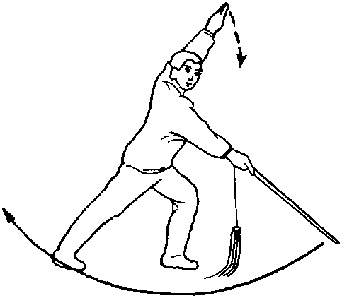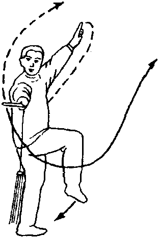 要点:此势先将右臂向 右侧后往前绕一大圆,然后 先甩穗,后提腕下点剑,腕 与胸同高。