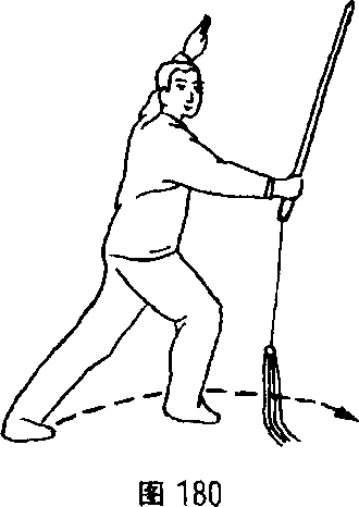 L右脚向前上步,屈膝弓腿,脚尖外撇,左腿微屈,脚跟 离地。同时右臂外旋,手心向上,向右上穿剑,使剑尖弧行向右 上。左剑指向下、向后划弧架于左侧上方。身体转向右,目视 剑身。(图180)