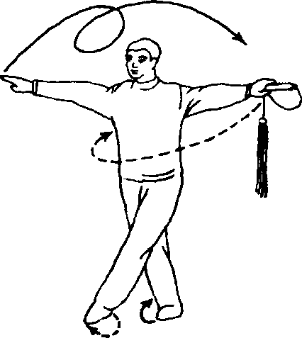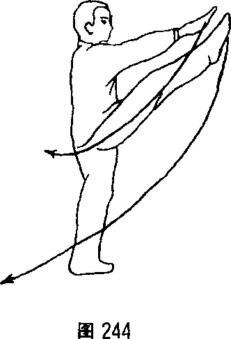 1. 转体摆臂:上体右转(向南),左脚随体转摆落到右脚 外侧,脚尖点地。同时右手翻转向下,同左臂随体平摆,两臂东 西成一字形。目视前方。(图242)