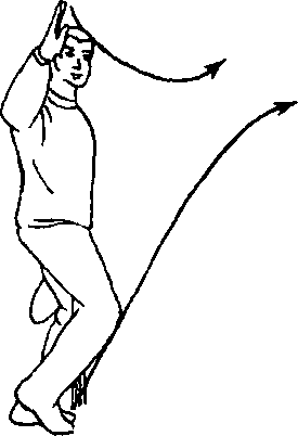 要点:提膝独立时,右臂上架与提膝同时进行,形成上下 合劲,右脚往下蹬,左膝往上提,剑柄往下垂,右臂反架要有绷 劲,这样独立才会稳定。