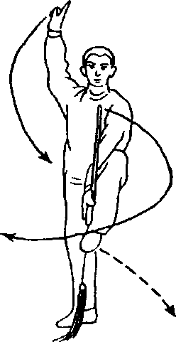 3. 摆莲拍脚:上体微左 转,左腿站稳,右脚向左上方 踢起,脚面绷平,扇形向右摆, 与胸同高。同时右掌经面前迎 击右脚面,准确响亮。左手反 持剑竖于左胯旁,剑尖向上。 目视右手。(图244)