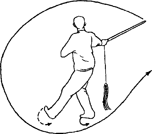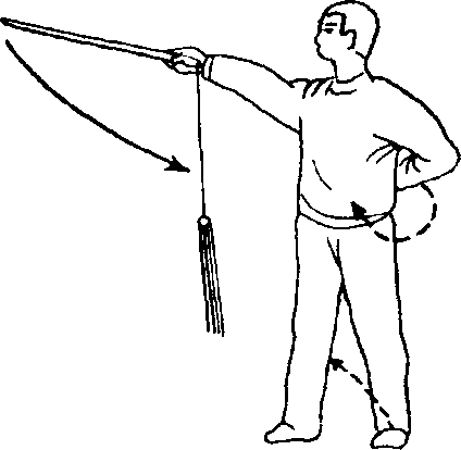 4. 背后接剑:上动不停, 左腕继续内旋,使剑柄云向东 方,随之向身后往右侧(正西 方)甩剑柄,将穗甩到西方。右 手从背后接过剑,直臂向西伸 直,手心向下,剑尖向西,与臂成
