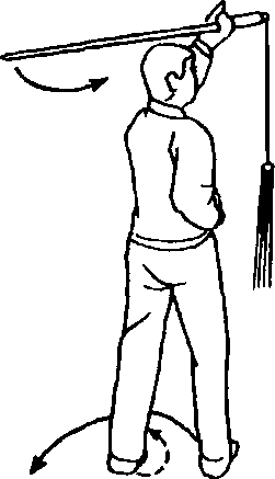 3. 转体云顶:接上动,左 脚插在右脚后,身体左转向南, 两脚成开立步。同时剑在头顶 上绕平圆(逆时针),待转向正 南时,左手直臂高托剑,剑柄向 右(西方),剑尖向左。目视前 方。(图300)