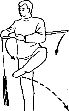 1. 提膝接剑:上体略左 转,右手持剑向胸前屈臂,手心 向下,剑尖向左。左剑指变掌, 翻转落下,手心向上,与右手心 斜相对,准备接剑。同时左腿屈 膝提起,脚尖向下。目视前方。 (图 297)