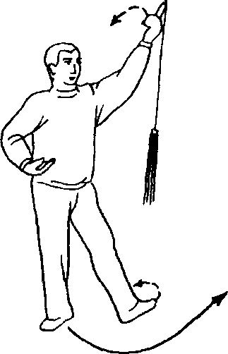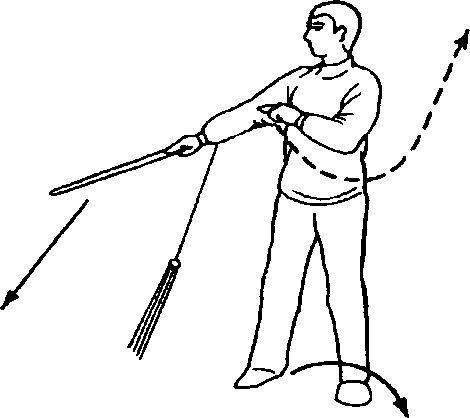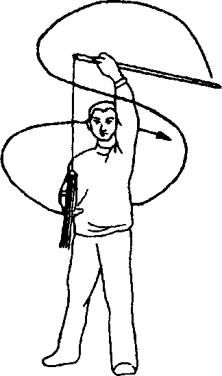 5<绕穗撩剑:上动不停, 以剑柄带穗(顺时针)绕立圆, 使剑时针方向撩绕。待剑顺绕