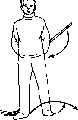 撇,右脚上步,左脚快速插到右 脚后,脚尖点地,身向西北。同 时右手握剑,手背贴住胯旁手 心向外,剑尖向东南。左剑指绕 到右前臂上,手心向右。目视前 方。(图 306、图 307)