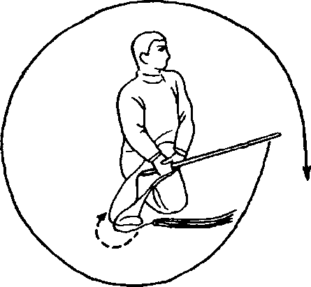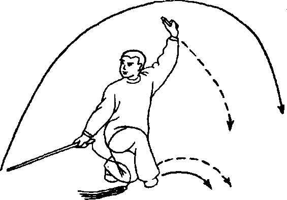 时针方向绕立圆,使剑尖向西方,与膝同高,手心向后,立剑撩