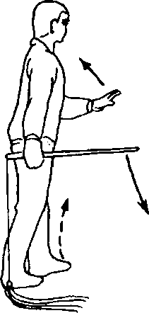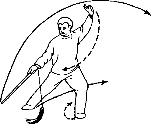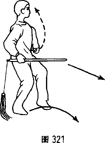 1. 落步卷剑:上体左转, 左腿向前落步,脚跟着地。同时 右手持剑屈臂外旋,将剑卷收 到腰间,手心向上,剑尖向左 (东北)。左剑指落于左腹前,手 心向上。目视东北方。(图 321)