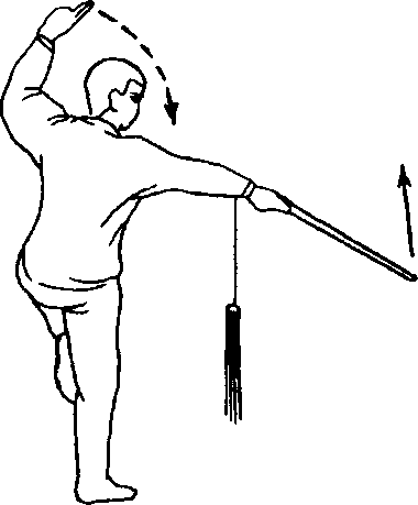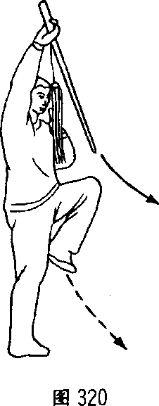 上体右转,右脚尖外撇。同时右手持剑内旋,以剑柄领先向上 提剑,剑尖向下,手心向外。左剑指在右肩前,手心向外。目视 剑身。(图320)