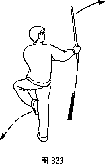 一立圆,剑身竖立,腕与胸同 高,剑尖仍指向东北方。左腿提 膝不落,仍保持独立步。左剑指 落到右肩前,手心向外。目视前 方。(图323)