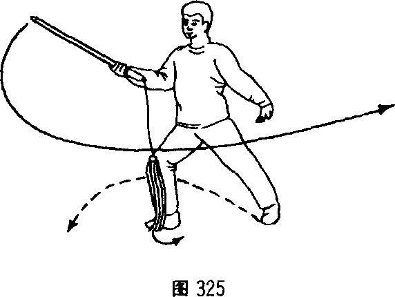 (三十五)玉兔旋窝1.独立云剑:右腿站稳, 上体向东北。右手持剑先内旋 后外旋腕云剑,使剑在胸前绕(三十五)玉兔旋窝1.独立云剑:右腿站稳, 上体向东北。右手持剑先内旋 后外旋腕云剑,使剑在胸前绕图322