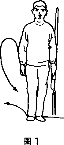 1. 身体正直,面向南方(假设,下同),两脚并拢直立,脚 尖向前。顶头竖颈,下须内收,两臂自然垂于身体两侧。左手 反持剑,剑身竖直,剑尖向上,左手中指勾住穗球部位(穗梢离 地面约15厘米)。右手握成剑指,手心向内,剑指向下。目视 前方。(图1)