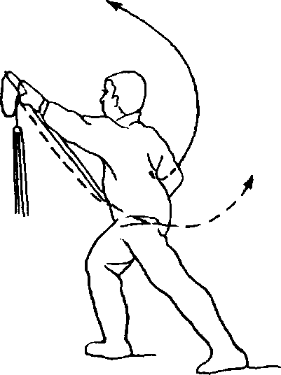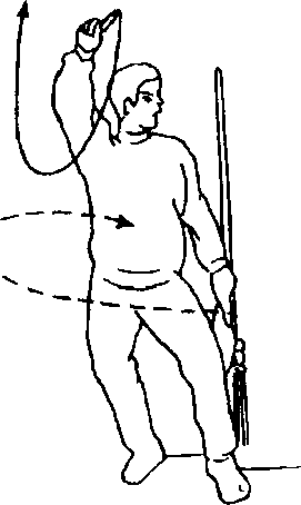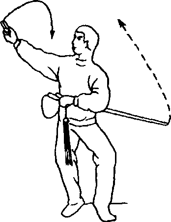 向),右手心向里,与头同高。左手持剑向上、向右绕到右肩前,手 心向外。目视右手剑指。(图5)