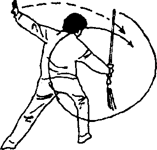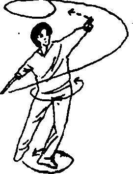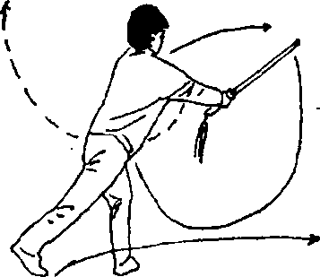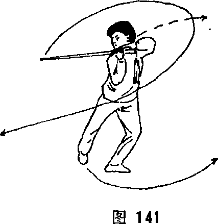 脚掌为轴,身体左后转360°,同时,右脚向左脚并拢,前脚掌 着地,腿伸直J右手持剑随转体向前上、向后、向右在头顶 上方平圆划弧,左剑指屈肘附于剑柄上方,虎口向下,上体向 右斜倾J目视右斜下方(见图140)。