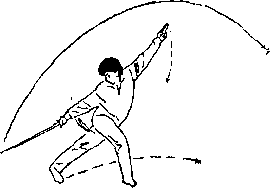 1 .身体左转,左脚向前 上步,腿微屈,右腿蹬直,脚跟 抬起;同时,右手臂外旋随转 体向上、向前抡劈,剑刃向上 下,臂伸宜,左剑指屈肘收至 右上臂内侧,手心向下多目视