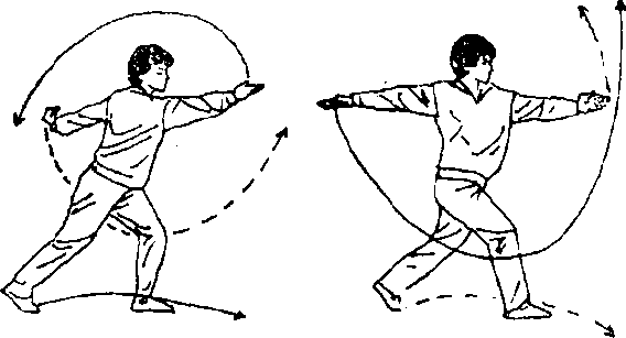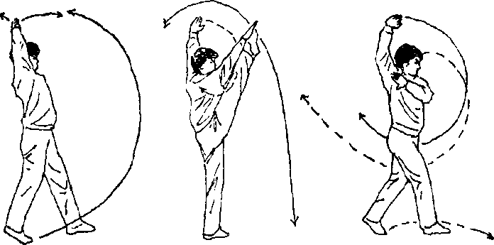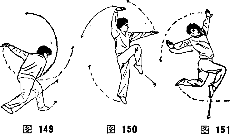 要求:前跃的距离要大于弓步,在空中挺胸、抬头、展 腹;两臂抡摆应配合前跳。