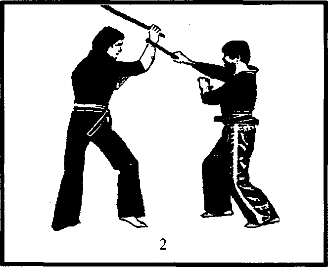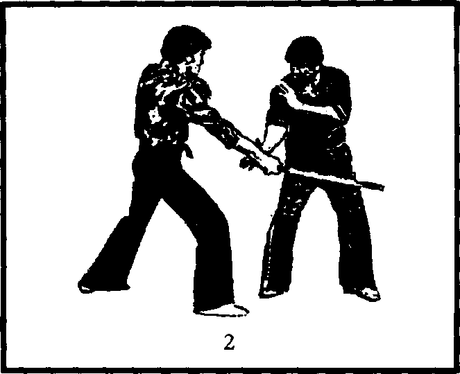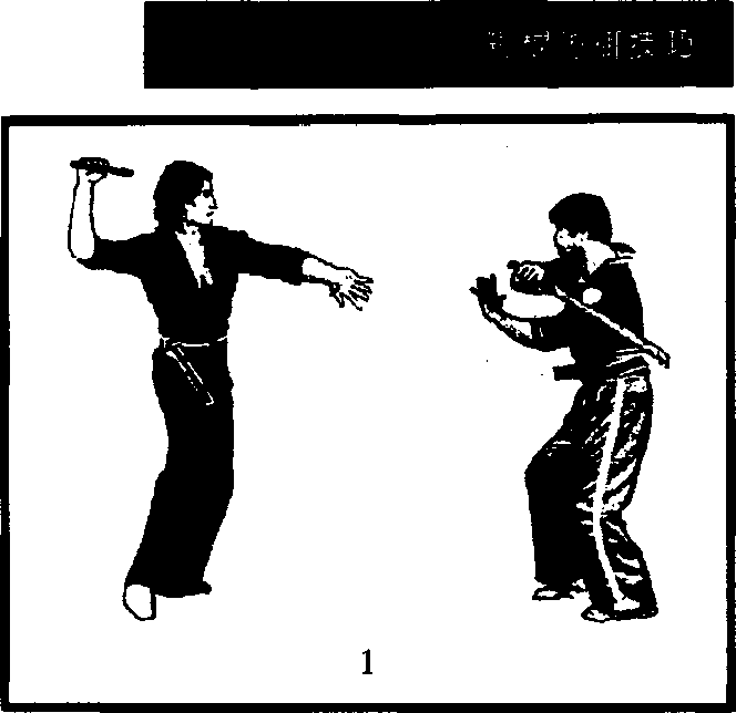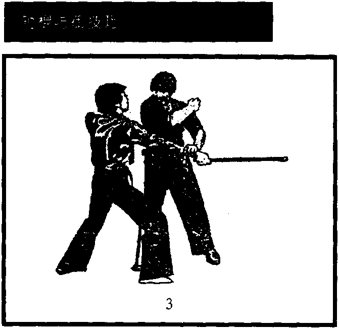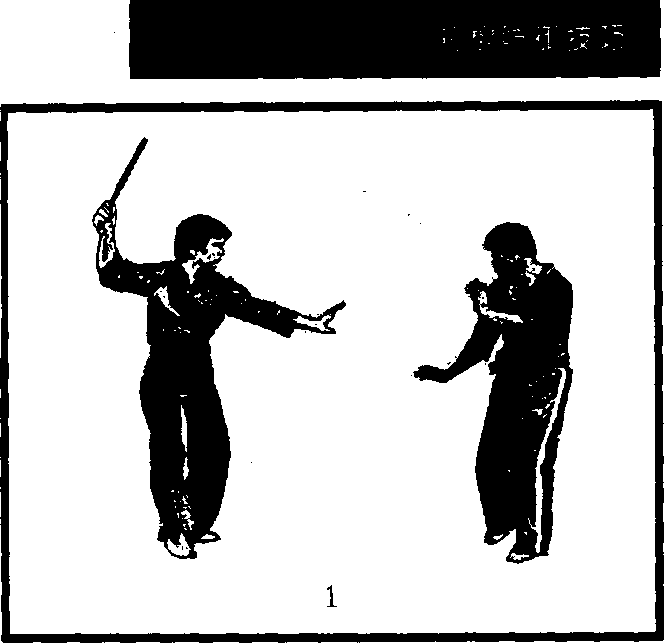 右手格挡时必须贴近,以格住对方的持棍手。换左手控制时 速度要快,并迅速后拉,同时猛然用右手甩击,使产生较大的合 力,以痛击对方,产生最大的效果。