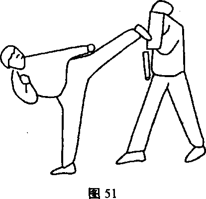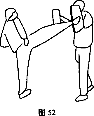 ④ 引靶速击练习,陪练在训练中用引靶使练习者快速出腿击 打(图51、图52)。