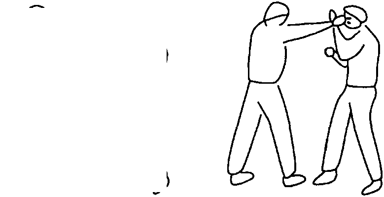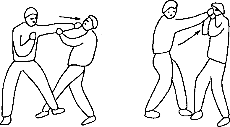 敌我双方成自卫格斗势(图452);我迅速滑步贴近敌方,并用