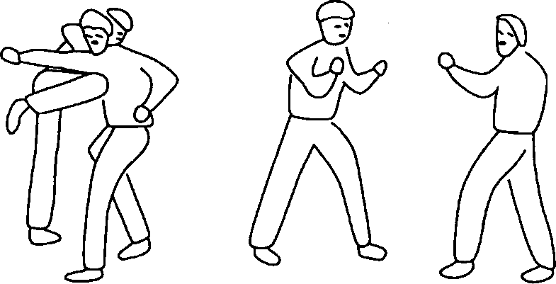 敌我双方成自卫格斗势(图457);我跃步上前,用左直拳、右 摆拳连续击打敌方之面眼部与左太阳穴(图458、图459),紧接着 再用右脚前踢敌之裆部(图460),然后,右脚落地,左转身,屈右肘 向左猛扫敌之头部左侧部位(图461 )o