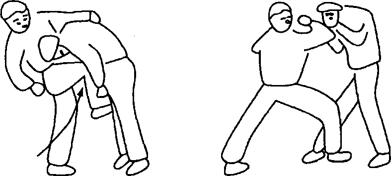 实施接腿摔时,其必然要靠近我方,这样又正好给我方的肘攻造成 了良好的条件°我方在肘击之后,再对其施以沉重的膝击,敌必定 因剧痛难忍而倒地。