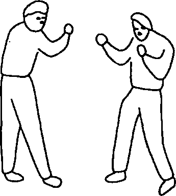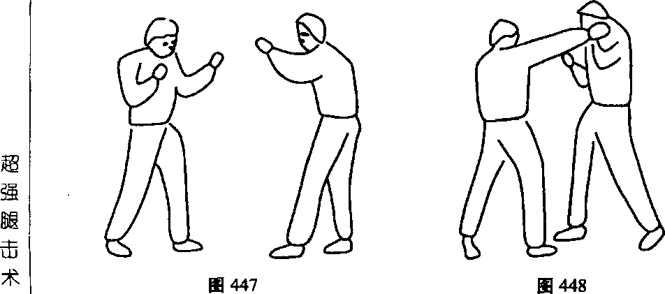 敌我双方成自卫格斗势(图452);我迅速滑步贴近敌方,并用