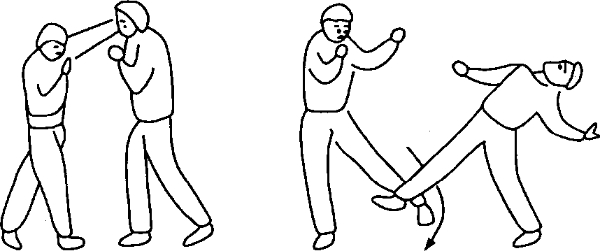 动作简析:当我方用拳击打时,敌方可能会用手架格或向后仰 身,这正好给我方扫腿踢造成可乘之机。而当敌方欲接我腿并欲