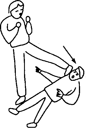 实施接腿摔时,其必然要靠近我方,这样又正好给我方的肘攻造成 了良好的条件°我方在肘击之后,再对其施以沉重的膝击,敌必定 因剧痛难忍而倒地。