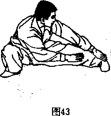 掌掌心朝上,贴左腿上侧向左足面插掌,右掌随势而动, 目视左掌(图43)。