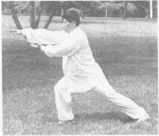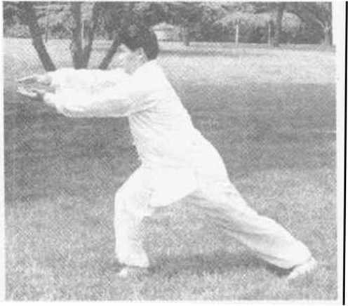 (11) 接上动作,胯向左转正,身体微向下沉,两手随胯上