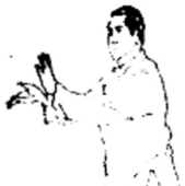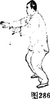 到双手大指,再分向左右略走上弧(与眼高同)展开,变略 顺缠腕外旋下沉,劲运松到双手中指肚,双臂展至7. 8分 坐腕,指尖高度比两肩略高,左手心向左前,指尖向上略偏 左前,右手掌心向右偏前,指尖向上偏右前。眼左顾右盼, 耳听身后。(图285, 286 )
