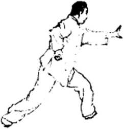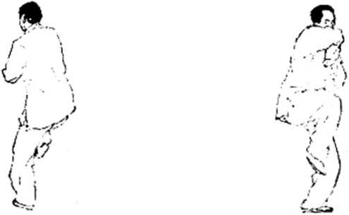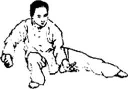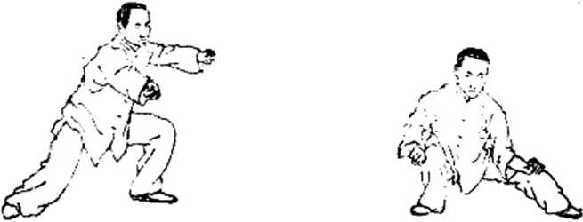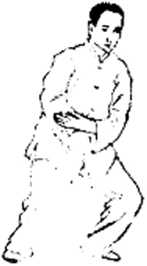 要领:这动作练时速度很快。要求身快速向左转时右胯 要放松、勿直。做到劲别对称,维持身体平衡。两腿要做到 开中有合,身要正,勿左歪右斜。