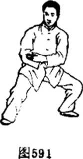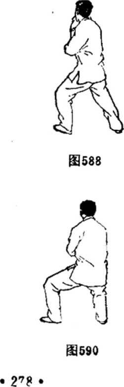 合,再逆缠腕内旋向右侧大腿外下沉,位在右膝外倒略下 方.坐腕臂半圆,微屈肘略坠,拳心向外卜方,虎口偏左前 下。眼先左顾右盼,再看身左侧,耳听右后方。(图580. 581 )
