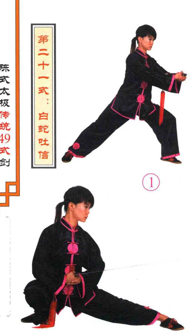 ?右脚向前落地,右腿屈膝成右 弓步;左腿用力前蹬。两手持剑 向前平刺与腰高,目视前方。