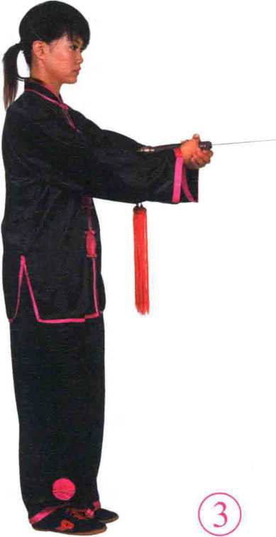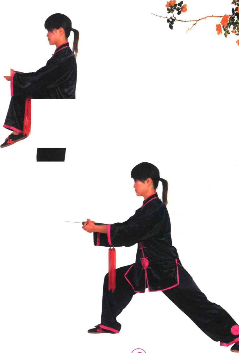 ?重心右移,右腿屈膝全蹲,左腿伸直。两手持 剑收至腹前,手心向上。目视左前方。