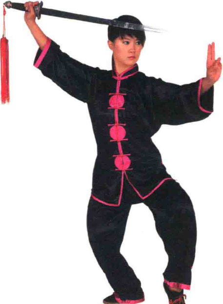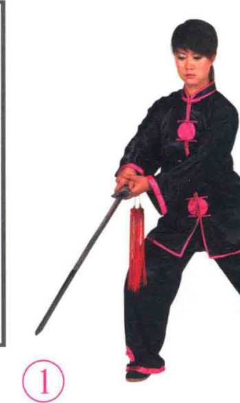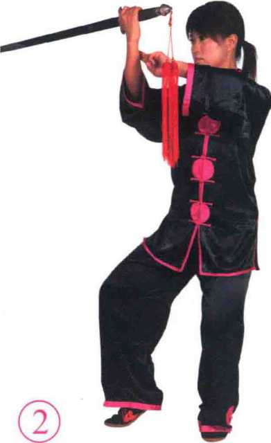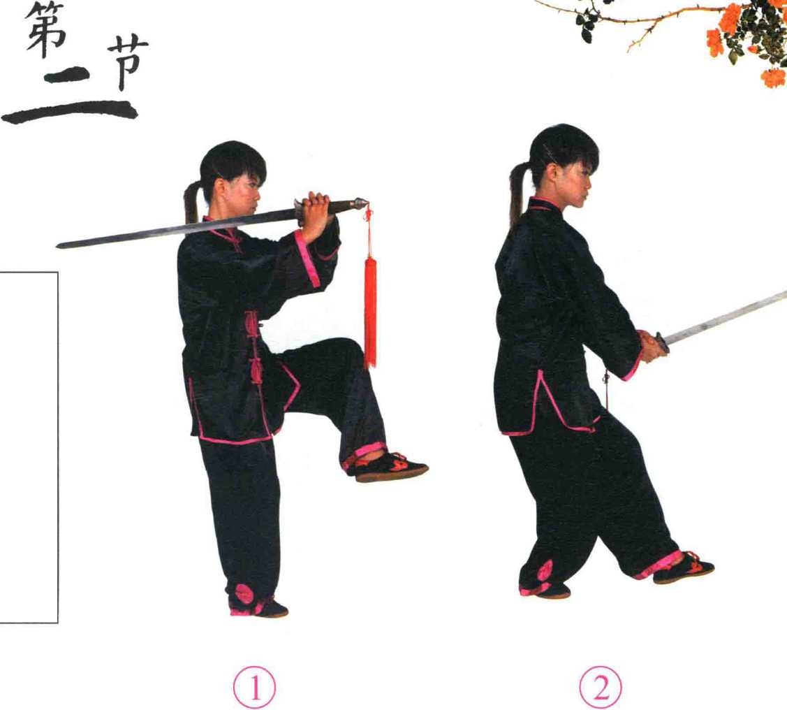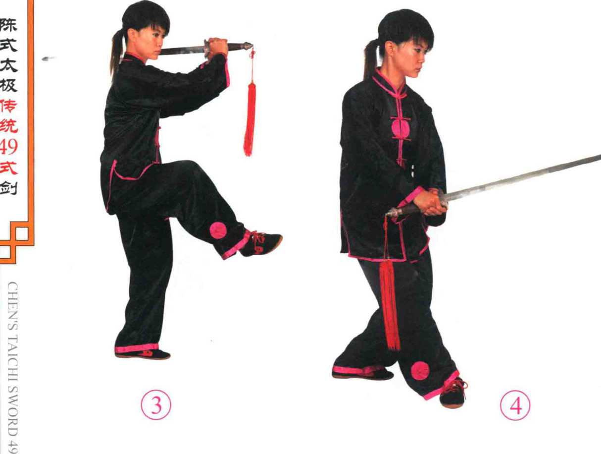 ?右腿屈膝提起,脚尖微外摆;左腿站 立,膝微屈,身体微左转。同时两手持 剑,剑尖从体前向下经身体左侧摆至身体 左后方与肩平。目视前方。