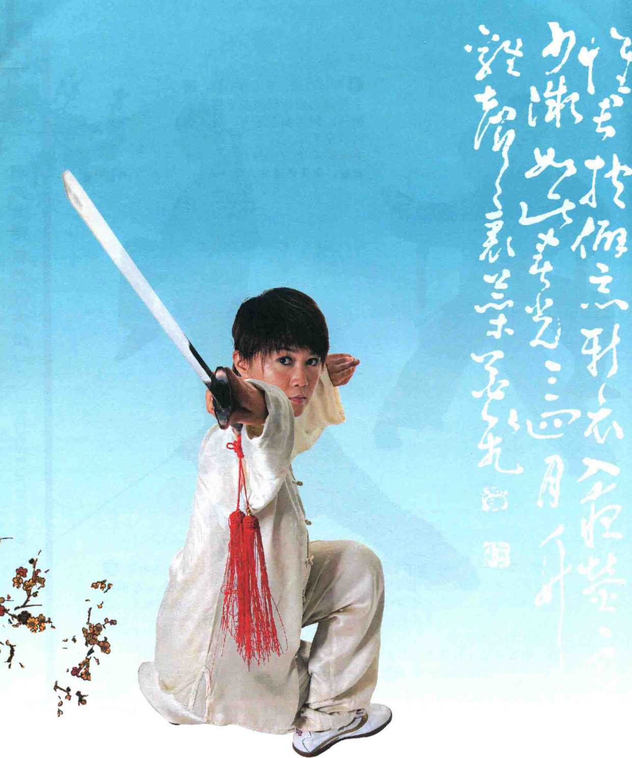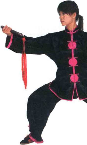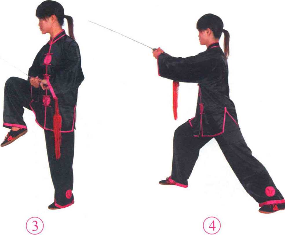 ?身体微右转,重心移至左腿,右腿 屈膝提起,右脚自然下垂。同时双手 抱剑柄向前划弧下沉,合于腹前,剑 尖朝斜上方。目视剑尖方向。