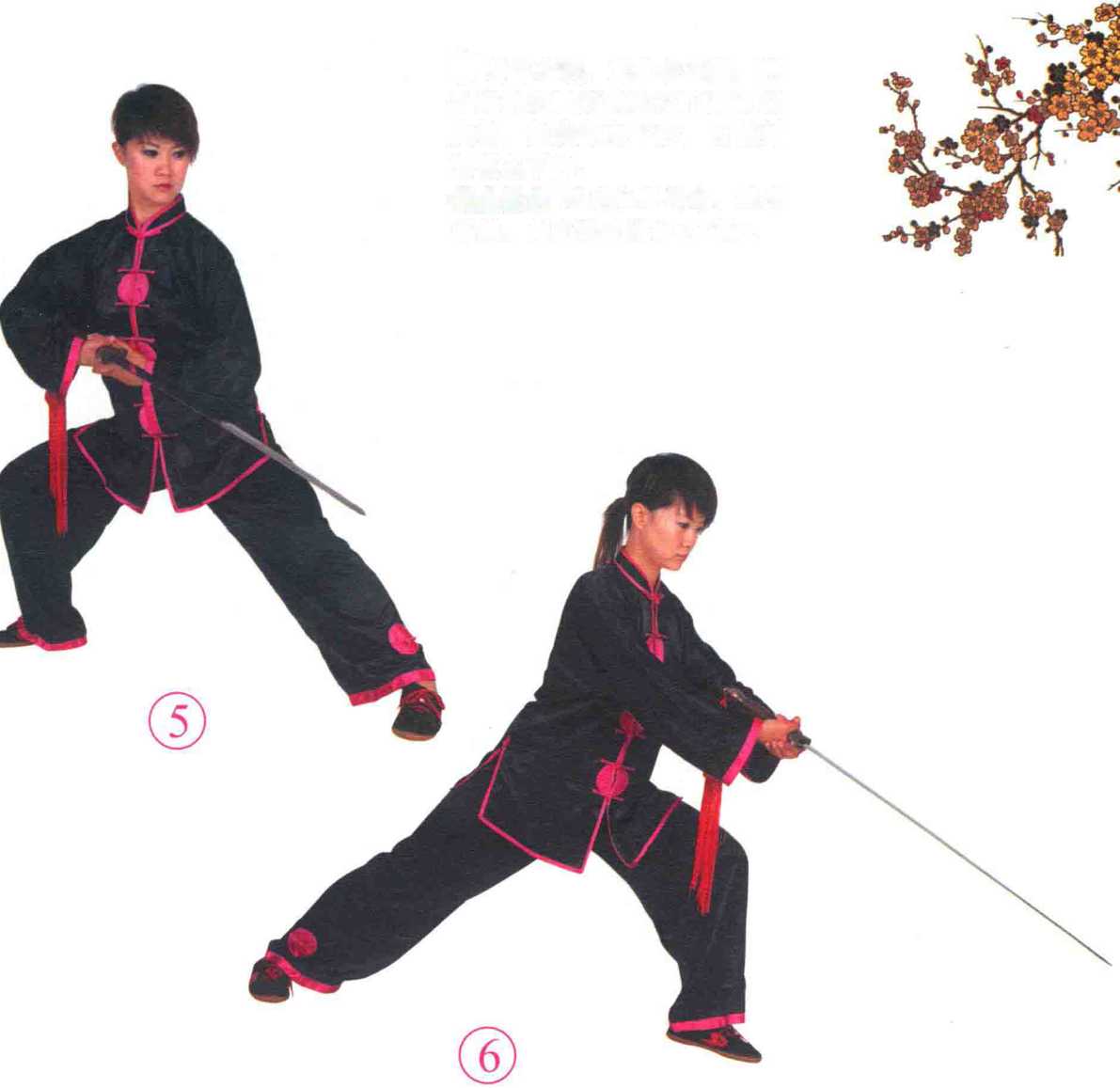 ?右腿向前上一大步,重心 移至右腿,成右弓步。两手持 剑向右上刺剑,剑尖斜向上。 目视剑尖。
