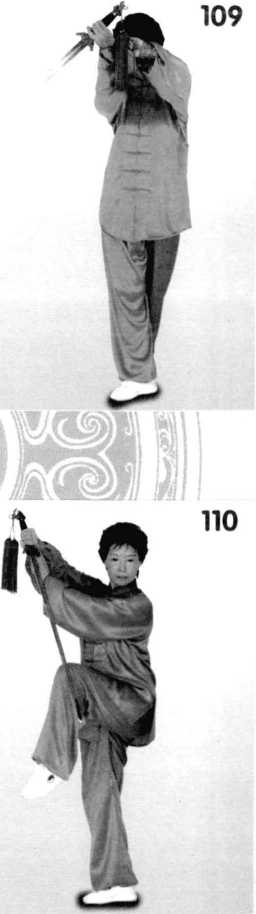2 .右脚向西北方向撤步, 重心移右,胸向西南,右手持 剑逆缠翻腕下沉至左胯外再上 提,领起左膝,成右独立步。 剑柄高与头平,斜立剑,剑尖 在左膝外侧向下。(图110)