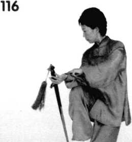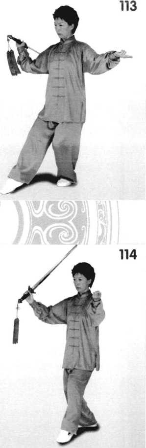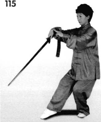 1 .胸向西南,重心在右, 成左虚步,左右手同时顺缠翻 腕开展至两胯外侧,手心皆斜 向里上,剑尖与剑指开中寓 合,眼看前方。(图112)