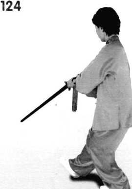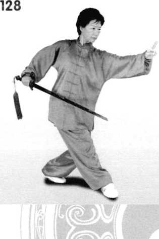 1 .胸向左后转,胸由西南 转向正南,右手顺缠带剑回 抽,左手剑指也顺缠下沉至左 腰外侧,然后左脚向左后方落 步,右手剑先向下抄再上穿 剑,手心向内,左手剑指前 指,手心向下,眼视剑尖。 (图 126、127)