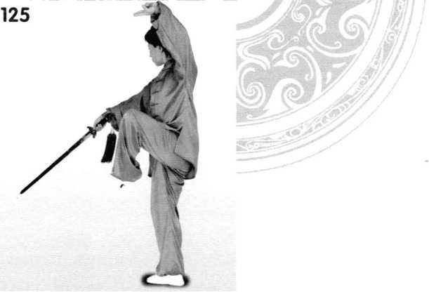 胸向西北,转向西,重心 移左,右手持剑顺缠下抄至腹 前,向左走下弧,右手剑和左 手剑指相合,提右腿成左独立 步同时向上将剑托起(类似金 鸡独立式),走腕劲上举。右 手心向里,剑尖向右前略偏下 (北),剑指附于右腕,眼视剑 尖。(图 122、123)
