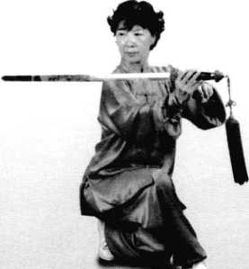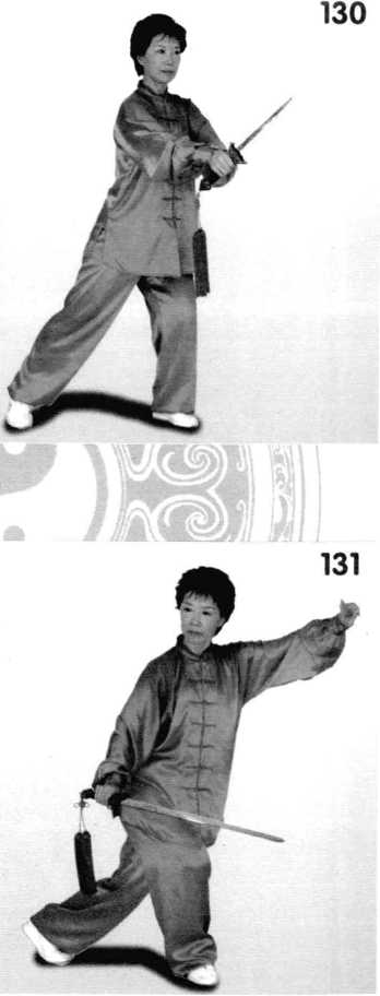 2 .胸向西南,重心移左, 右脚顺缠向左脚前盖步,脚尖 外摆,胸向南,重心移右,两 腿交叉屈膝下蹲,左脚跟离 地,双手合,右手剑顺缠里折 腕,剑把在右肩前上方,手心 斜向里,剑尖斜略走上弧向右 后刺,立剑,剑尖向西,剑指 在右肩前附于右腕,指尖向右 (西),手心斜向外,眼视剑 尖。(图 128、129)