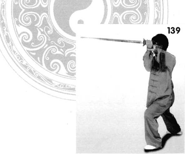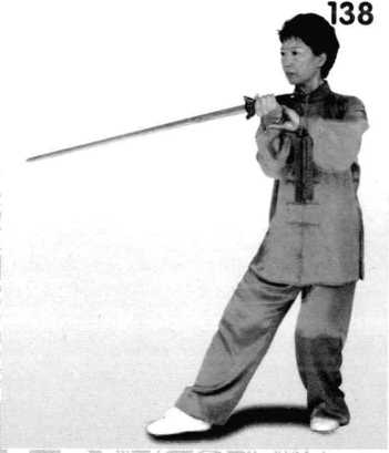 1 .胸向西南,重心在右, 身体微左转,提左腿,左脚向 左前方斜角上步,右手持剑随 左脚上略走下弧合至左胸前 方,左手剑指附于右腕,眼视 剑尖。(图 136、137)